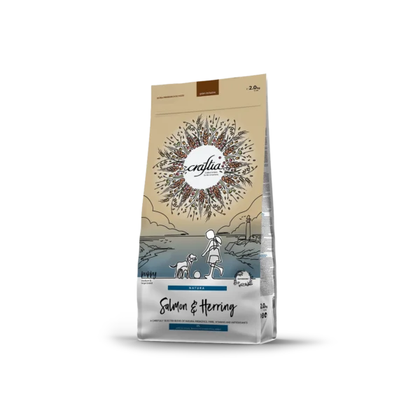 Composition: salmon (15%), dehydrated herring protein (15%), herring (11%), dehydrated salmon protein (11%), hydrolyzed fish proteins, fish oil (from salmon), linseed, spelt, brown rice, barley, oats, millet, dried shrimps (source of glucosamine and chondroitin sulphate), dried beet pulp, alfalfa meal, pea fibre, dried apple (0.5%), dried asparagus (0.5%), dried blueberry, dried cranberry, dried cherry, chicory inulin (0.4%), yeast extract (source of manno-oligo-saccharides) (0.3%), fructo-oligosaccharides (0.3%), Ascophyllum Nodosum, calcium carbonate, monocalcium phosphate, potassium chloride, sodium chloride, dried brewers’ yeast, aloe vera, rosemary, turmeric, marigold, psyllium husks and seeds, Yucca schidigera.