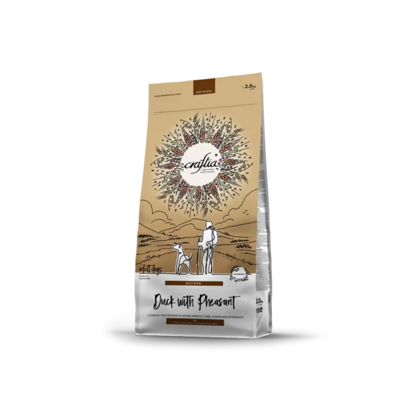 Composition: raw duck (19%), raw pheasant (7%), dehydrated duck protein (7%), dehydrated pheasant protein (7%), chicken fat, hydrolyzed poultry proteins, hydrolyzed fish proteins, fish oil (from salmon), dried eggs, spelt, brown rice, barley, oats, millet, chicken giblets (liver, heart, kidney), linseed, dried beet pulp, alfalfa meal, pea fibre, dried artichoke (0.5%), dried cherry (0.5%), dried blueberry, dried cranberry, chicory inulin (0.4%), yeast extract (source of manno-oligo-saccharides) (0.3%), fructo-oligosaccharides (0.3%), Ascophyllum Nodosum, calcium carbonate, monocalcium phosphate, potassium chloride, sodium chloride, dried brewers’ yeast, glucosamine, chondroitin sulphate, aloe vera, rosemary, turmeric, marigold, psyllium husks and seeds, Yucca schidigera.
