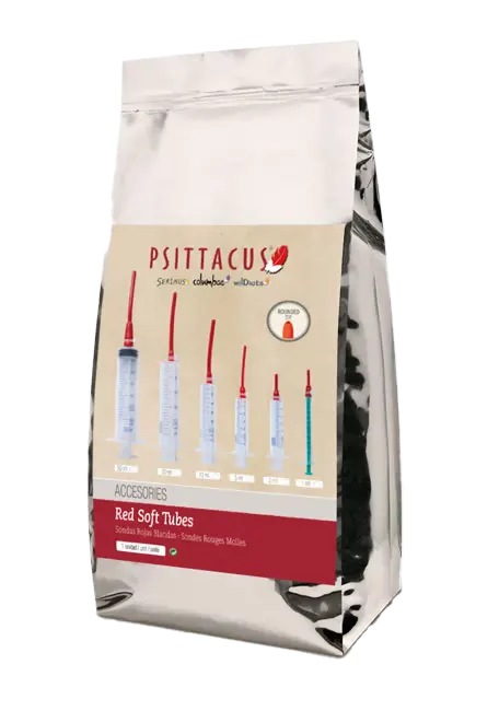 Thus, for example, for African gray parrots the 5 ml soft tube is suitable for administering the hand-feeding formula to babies up to 7 days old. The 10 ml soft feeding tube is ideal for African grey parrots up to 14 days of age; that of 20 ml is for chicks up to 4 weeks of age and from the month of age it is recommended to use the 50 ml soft feeding tube.