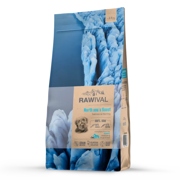 Composition: salmon (15%), dehydrated herring protein (15%), dehydrated salmon protein (13%), herring (11%), hydrolyzed fish proteins (cod, haddock), fish oil (from salmon), linseed, spelt, brown rice, barley, oats, millet, dried shrimps (source of glucosamine and chondroitin sulphate), dried beet pulp, alfalfa meal, pea fibre, chicory inulin (0.4%), yeast extract (source of manno-oligo-saccharides) (0.3%), fructo-oligosaccharides (0.3%), Ascophyllum Nodosum, calcium carbonate, monocalcium phosphate, potassium chloride, sodium chloride, dried brewers’ yeast, dried apple, dried asparagus, dried blueberry, dried cranberry, dried cherry, aloe vera, dried rosemary, dried turmeric, dried marigold, psyllium husks and seeds, Yucca schidigera.