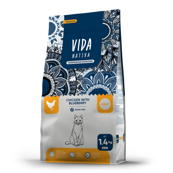 Composition: dehydrated chicken protein (24%), potatoes, pea starch, raw chicken (11%), chicken fat, hydrolyzed poultry proteins, dried eggs, linseed, fish oil (from salmon), blueberry (4%), broccoli (4%), asparagus, spinach, dried beet pulp, alfalfa meal, pea fibre, calcium carbonate, monocalcium phosphate, potassium chloride, sodium chloride, dried brewers’ yeast, chicory inulin (0.4%), yeast extract (source of manno-oligo-saccharides) (0.2%), fructo-oligosaccharides (0.2%), Ascophyllum Nodosum, dried mint, marigold, psyllium husks and seeds, Yucca schidigera.