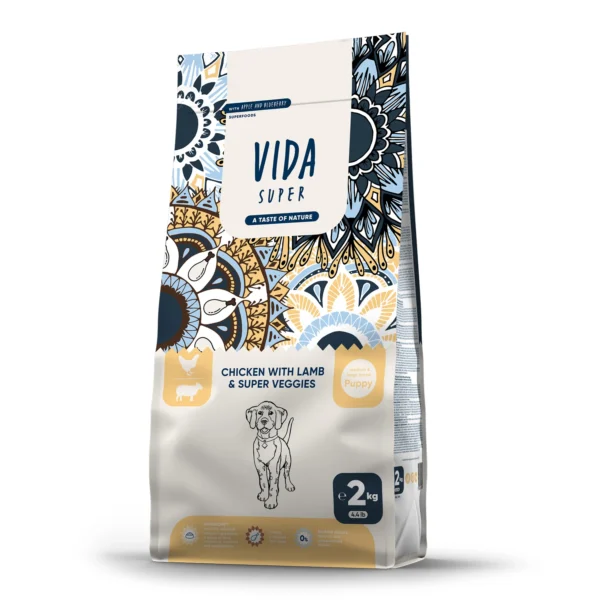Vida Super Chicken, Lamb & Veggies is a premium puppy food for medium and large breeds with chicken lamb and vegetables. Chicken and lamb make a delicious and healthy combination. This mix is a great source of protein, essential for strong bones and healthy joints, while superfoods like veggies also provide fiber and antioxidants, which help strengthen the immune system.